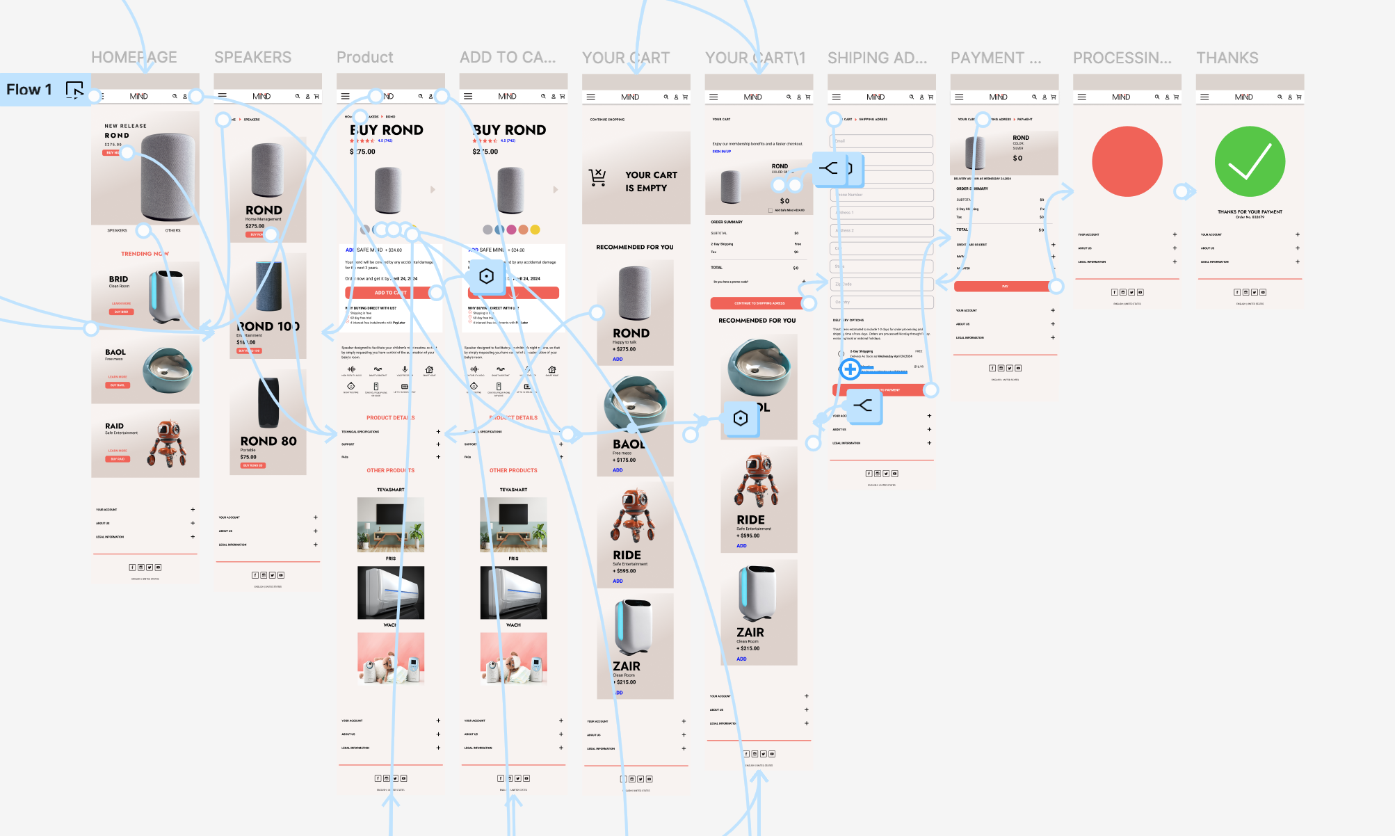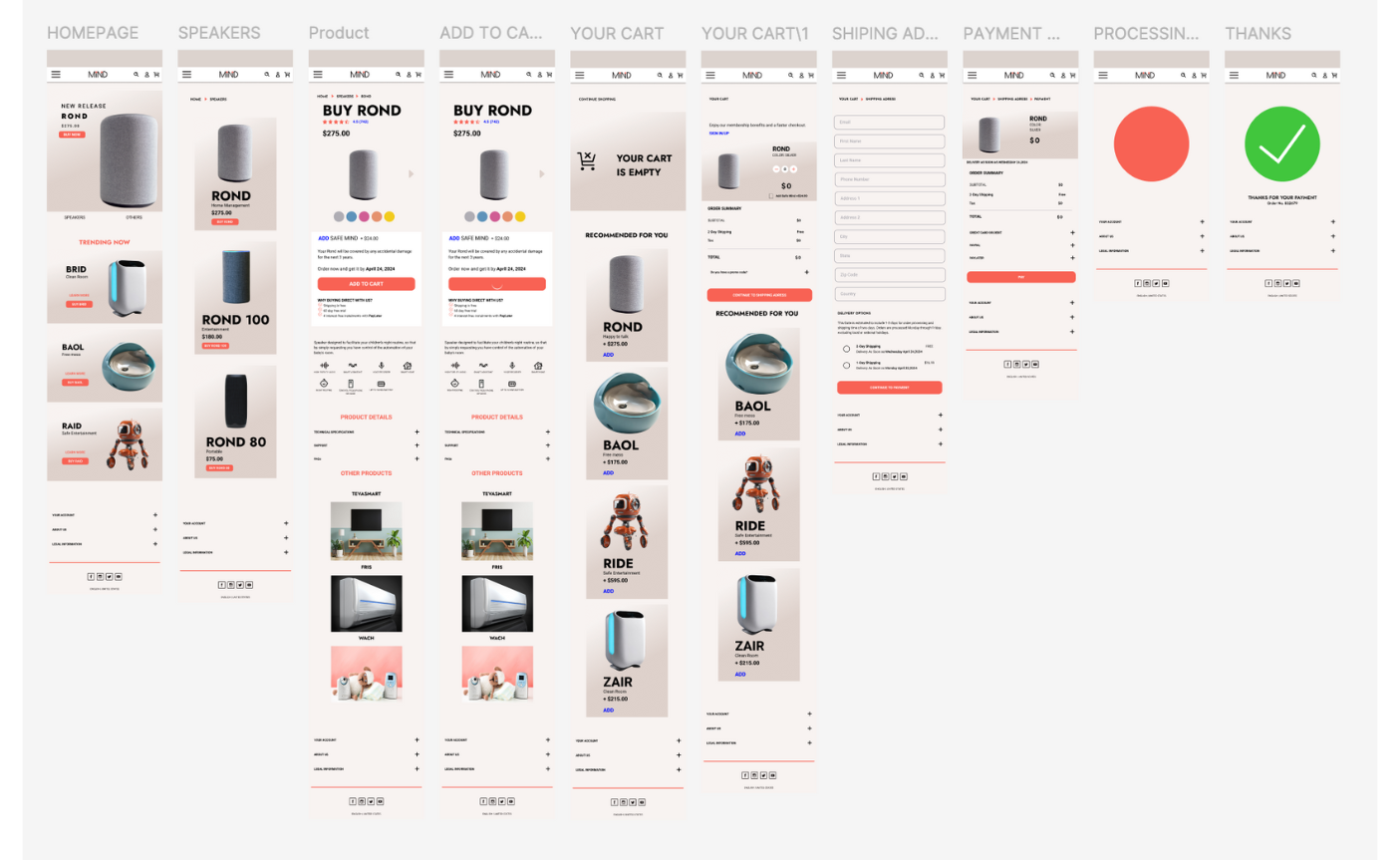 For my second school project, I conceptualized and designed a specialized product and its branding—a smart speaker tailored for mothers to assist them during nightly routines. Within a broader technology brand featuring various products, I introduced ROND, the name of this innovative speaker. Throughout the project, I utilized advanced techniques such as auto layouts and variables to streamline the cart and checkout processes. Additionally, I incorporated animated GIFs to enhance user interaction and engagement.